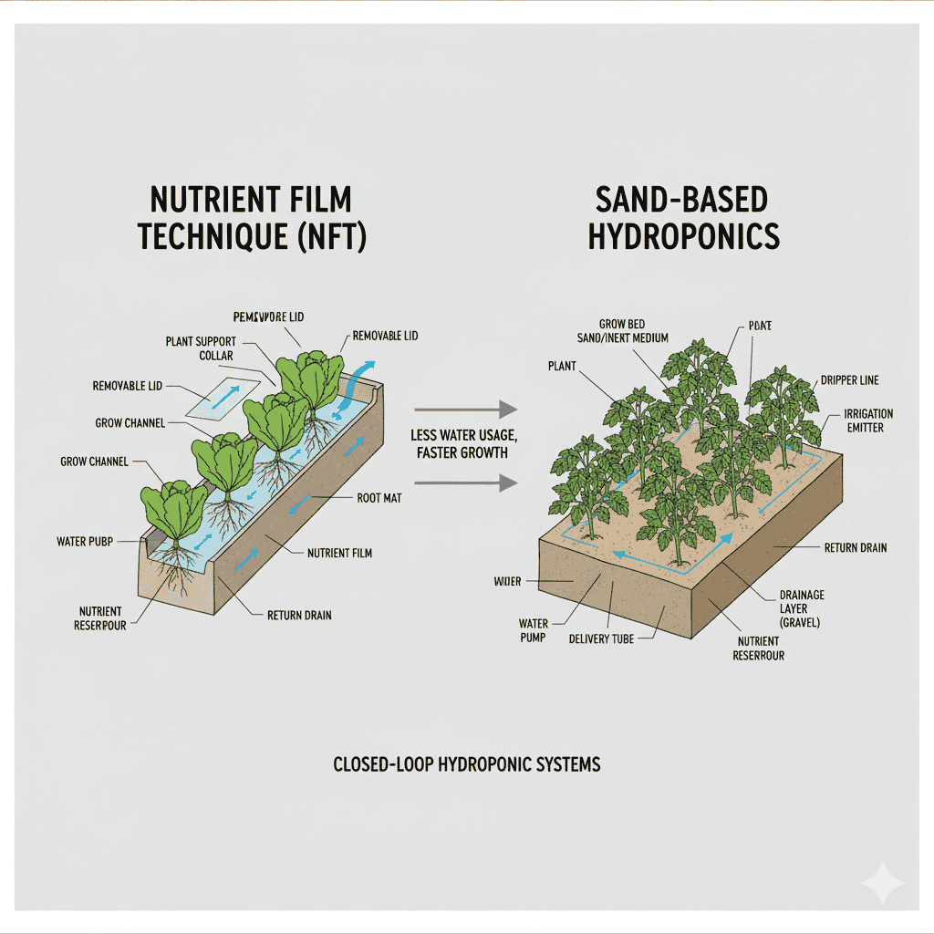 Plants grow in sand or cocopean, with nutrients delivered through pipes or drip systems.